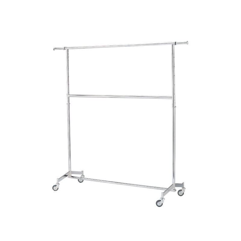 Perchero gran resistencia con barra supletoria. Con ruedas de goma, dos de ellas con freno. La altura se regula mediante ganchos.