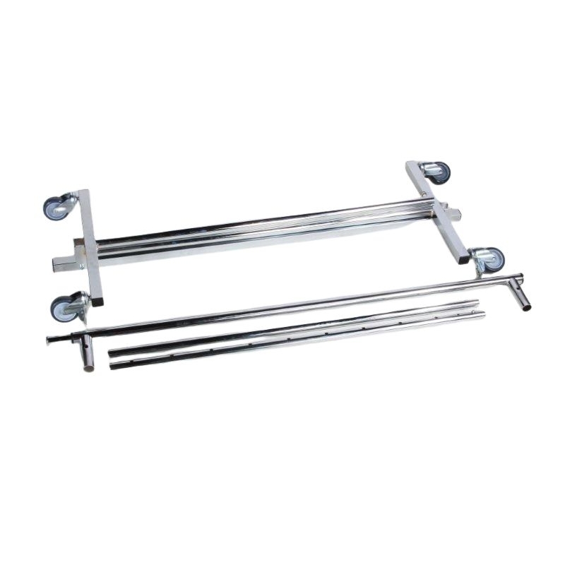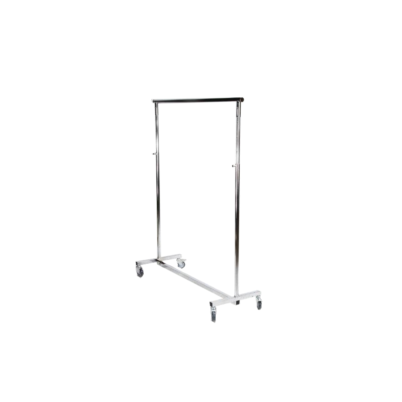 Perchero plegable con ruedas de goma, dos de ellas con freno. se regula la altura por medio de tiradores de muelle. El cabezal es extensible para mayor capacidad.